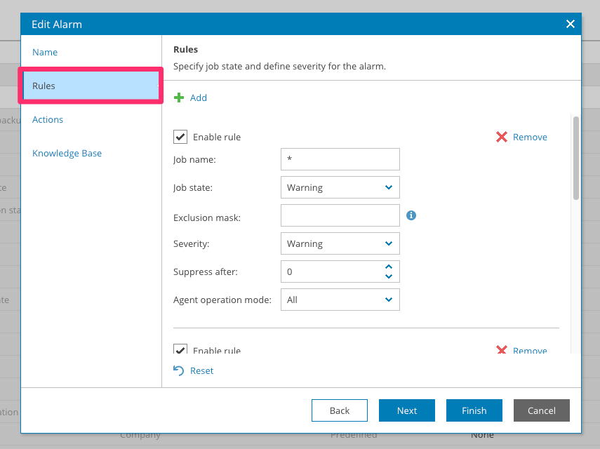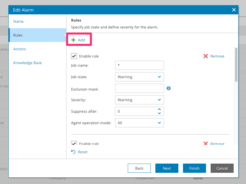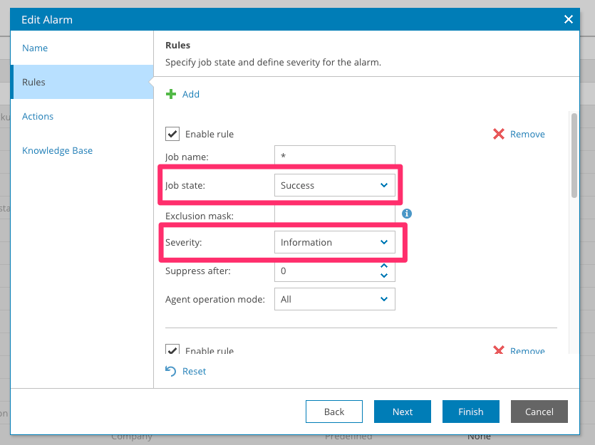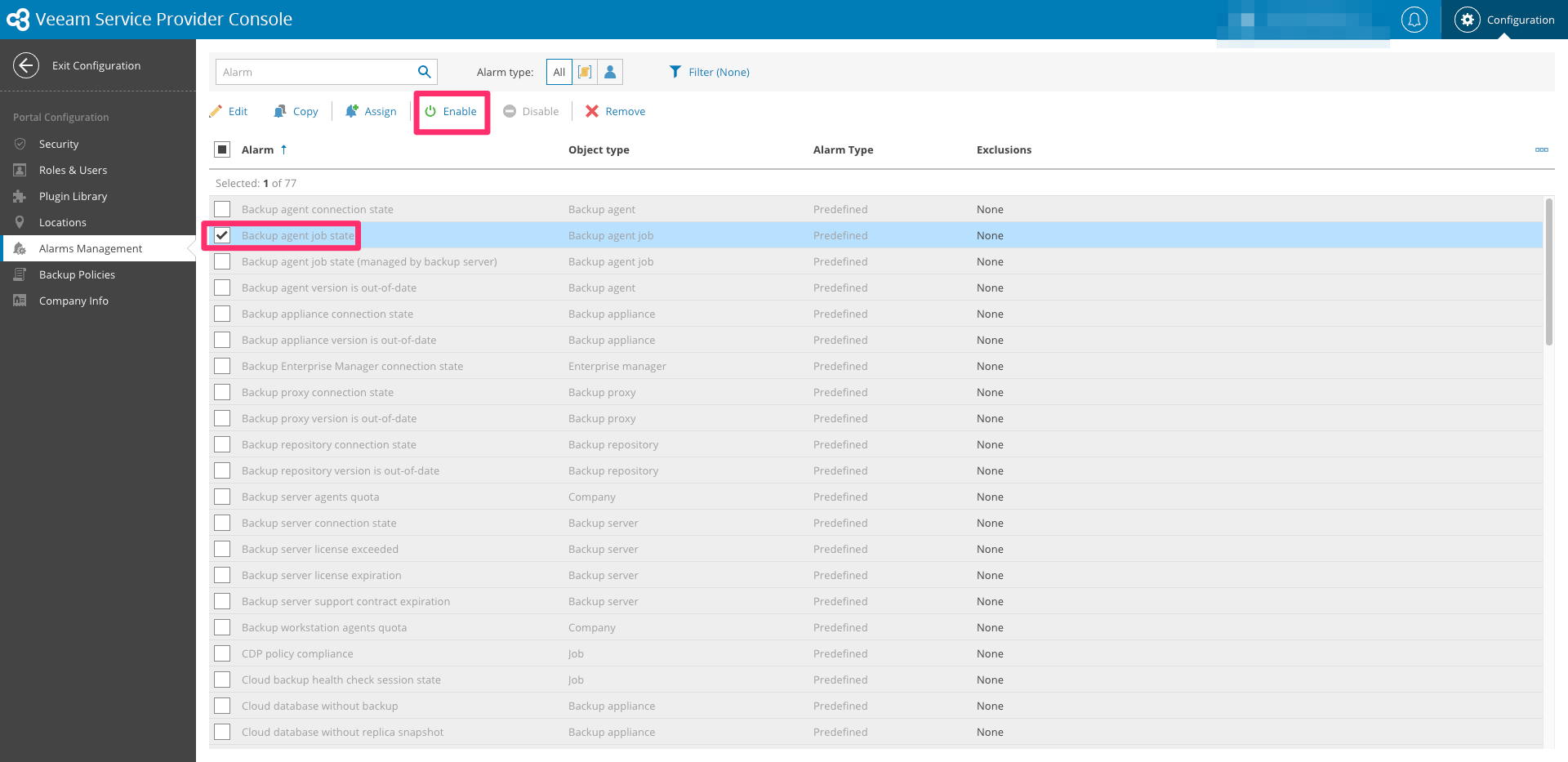 Alarm の一覧から 「Backup agent job state」 を見つけ、Enable をクリックします。