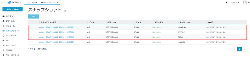 - スナップショット一覧より、指定した期日どおりにスナップショットが作成されていることを確認します。