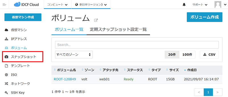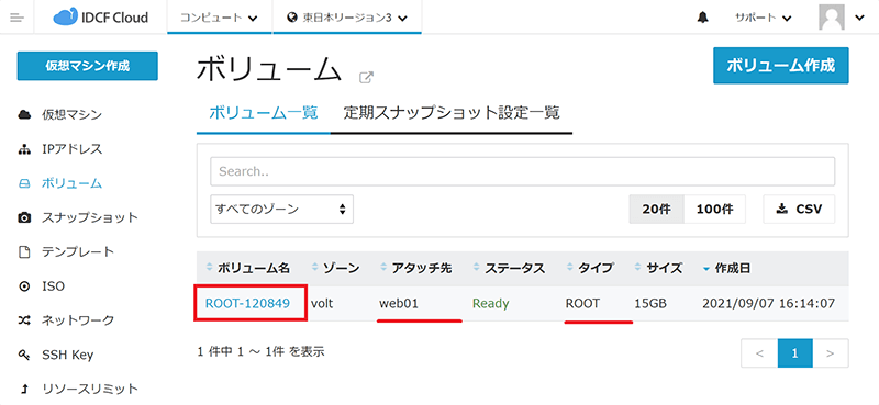 - 表示されたボリューム一覧より、「ボリューム名」「アタッチ先」「タイプ」等から、スナップショット対象のボリュームを確認し、「ボリューム名」をクリックします。