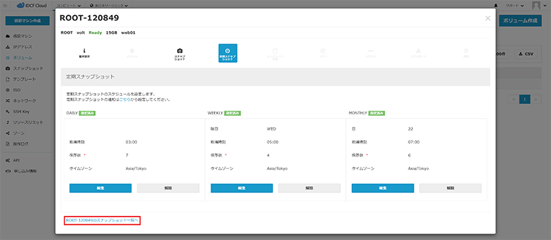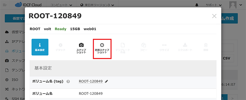 - ボリューム詳細画面にて[定期スナップショット]をクリックします。
