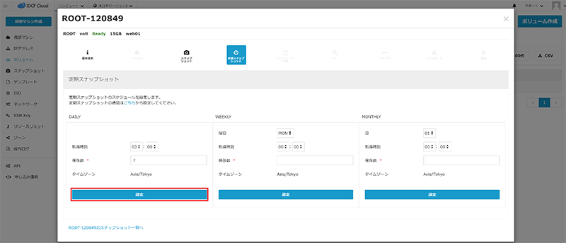 - 定期スナップショットの取得時刻、保存数を設定します。