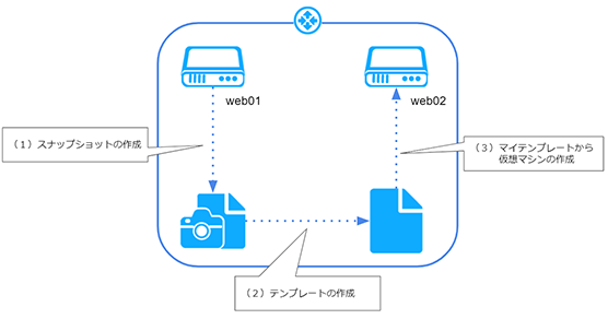 ここでは、活用マニュアル「Webサイトの本番環境を構築したい(Web1台構成)」で作成した仮想マシン「web01」のスナップショットからテンプレートを作成し、そのテンプレートからもう1台仮想マシンを作成する手順を紹介します。