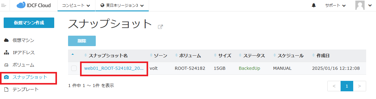 - 左メニューから[スナップショット]をクリックし、スナップショット一覧より、上記手順で作成したスナップショットの「スナップショット名」をクリックします。