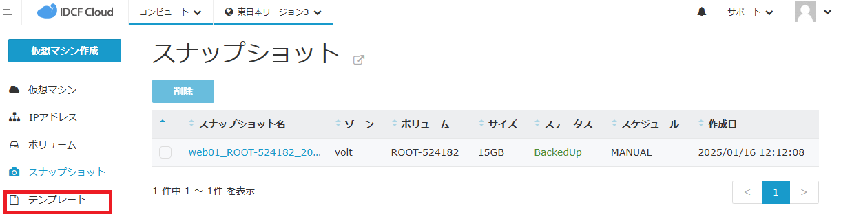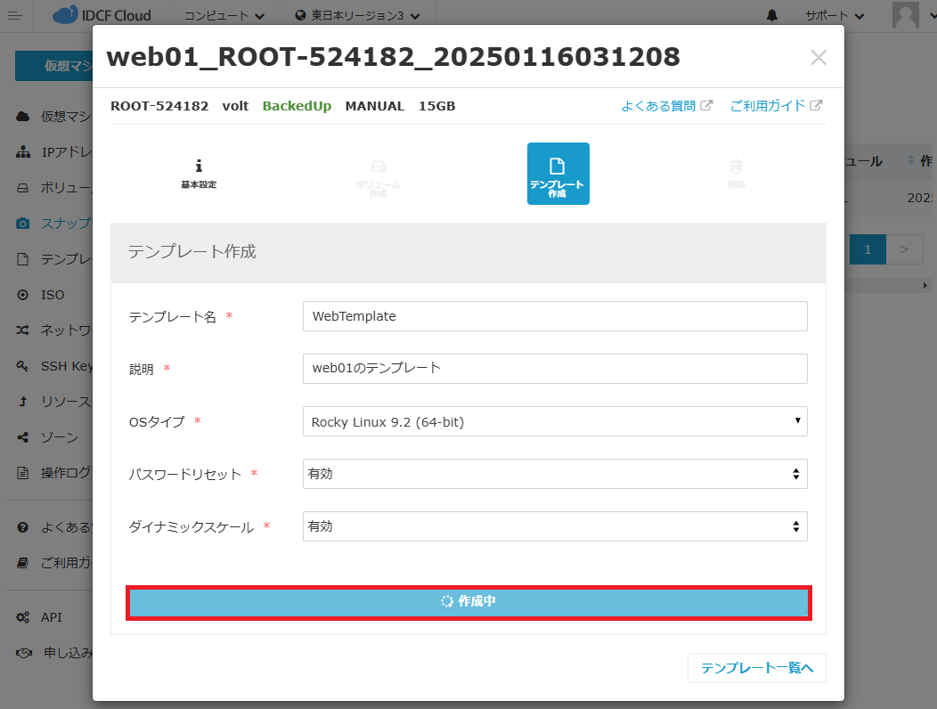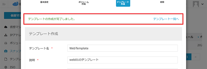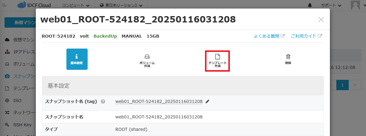 - スナップショット詳細画面にて[テンプレート作成]をクリックします。