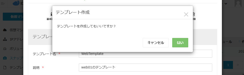 - 「テンプレートを作成してもいいですか?」というポップアップが表示されるので[はい]をクリックします。