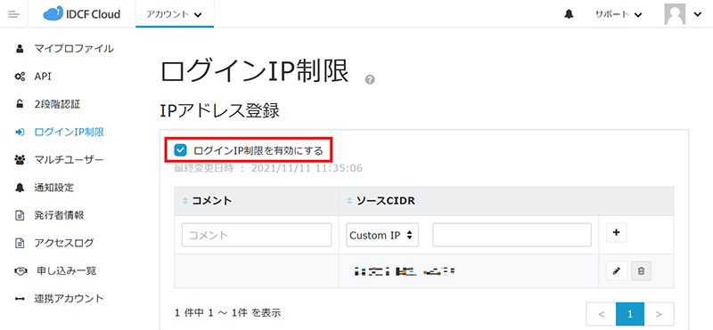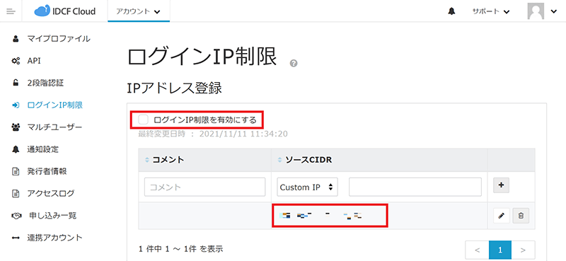 ※この状態で次回のログインからログインIP制限が有効となります。