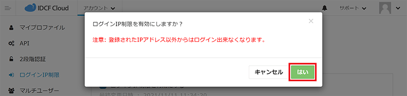 - ログインIP制限の有効化確認のポップアップ画面が表示されますので、注意内容を確認し[はい]をクリックします。