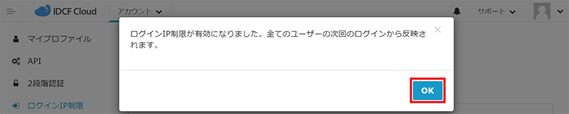 - 「ログインIP制限が有効になりました。」というポップアップ画面が表示されますので、[OK]をクリックします。