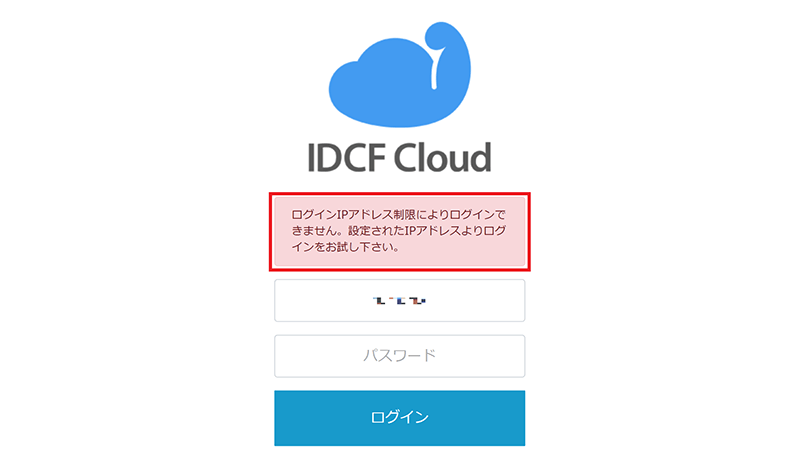 次のようなエラー画面が出た場合は、ログインIPの登録に問題がありますので、⑥で確認した画面にて[ログインIP制限を有効にする]のチェックを外して、ログインIP制限を無効にした上で、再度登録をしなおしてください。