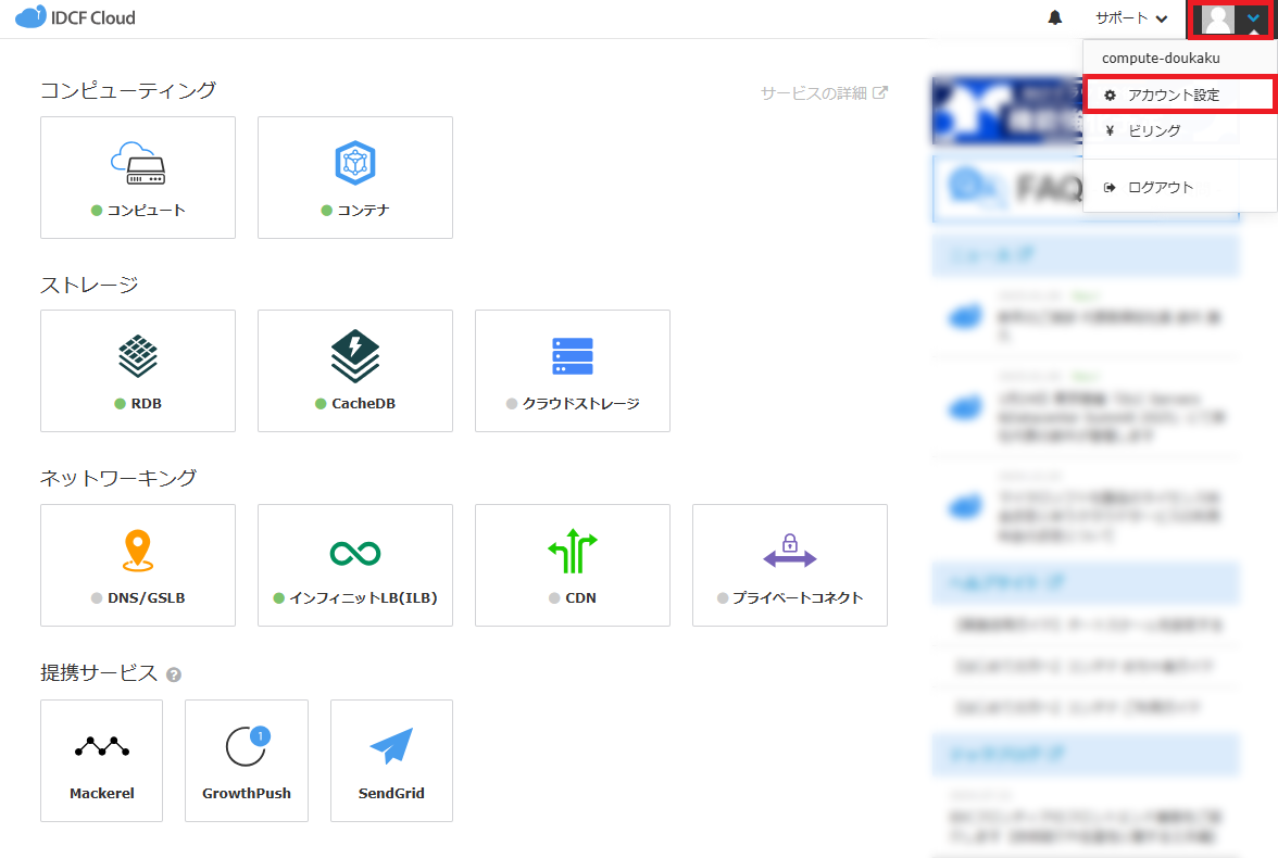 - クラウドコンソール右上のアイコンをクリックし、プルダウンメニューから[アカウント設定]をクリックします。