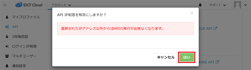 - API IPアドレス制限有効化確認のポップアップ画面が表示されますので、注意内容を確認し[はい]をクリックします。