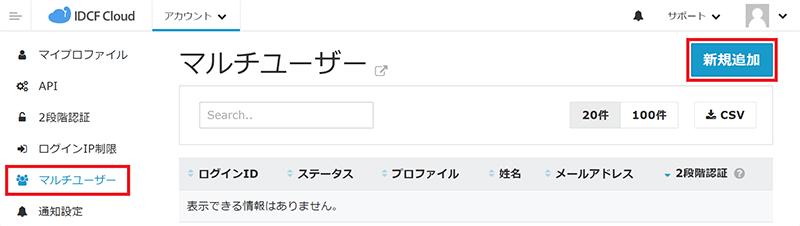 - 左メニューから[マルチユーザー]をクリックし、マルチユーザー画面を表示します。[新規追加]をクリックしてユーザー追加画面を表示します。