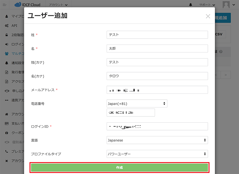 - ユーザー追加画面にて、情報を入力し[作成]をクリックします。