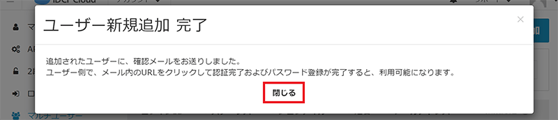 - ユーザー新規追加完了のポップアップ画面が表示されますので[閉じる]クリックします。