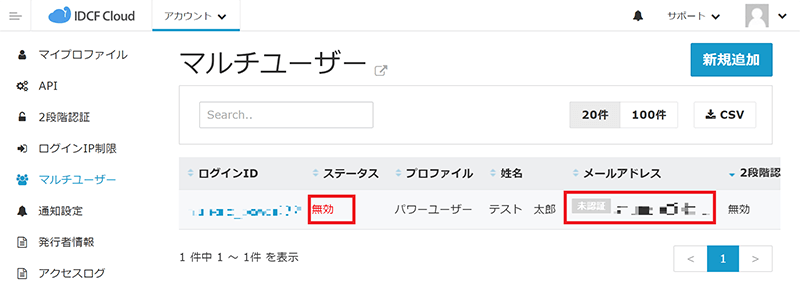 - マルチユーザー画面に戻るので、先ほど登録したユーザーのステータスが「無効」、メールアドレスが「未認証」になっていることを確認します。