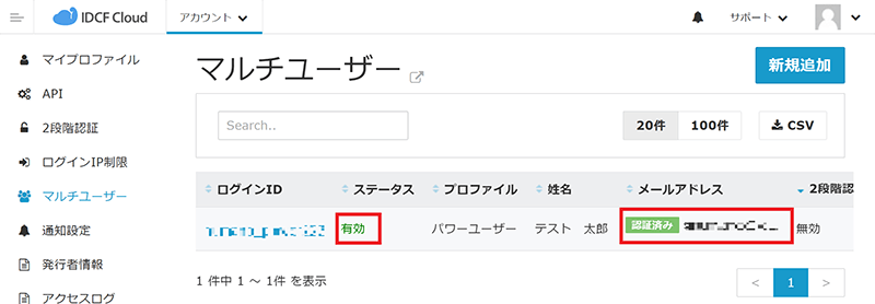 - パワーユーザーのユーザー登録が完了後、マルチユーザー画面にて当該ユーザーのステータスが「有効」、メールアドレスが「認証済」になったことを確認します。