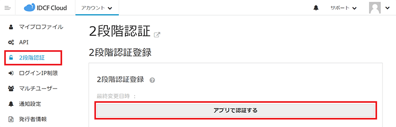 - メニューから[2段階認証]をクリックし、[アプリで認証する]をクリックします。