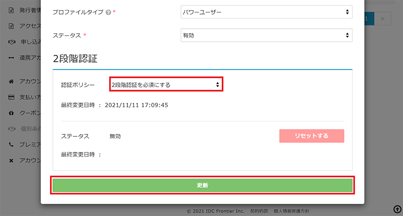 当該ユーザーのユーザー編集画面の下部の2段階認証の項目を表示します。認証ポリシー[2段階認証を必須にする]を選択して[更新]をクリックします。