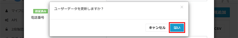 - ユーザーデータを更新するか確認のポップアップ画面が表示されるので、[はい]をクリックします。