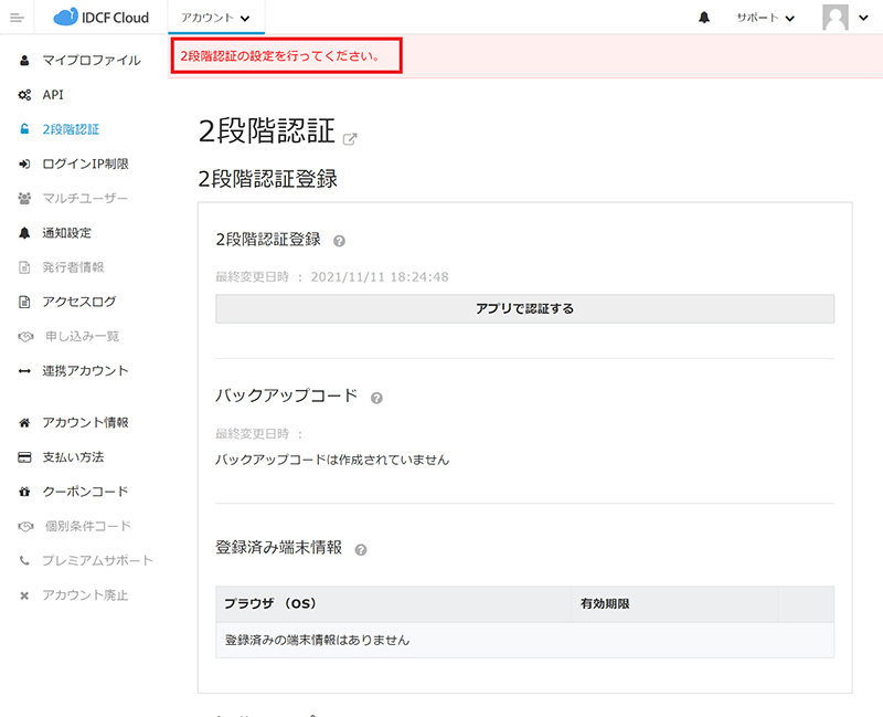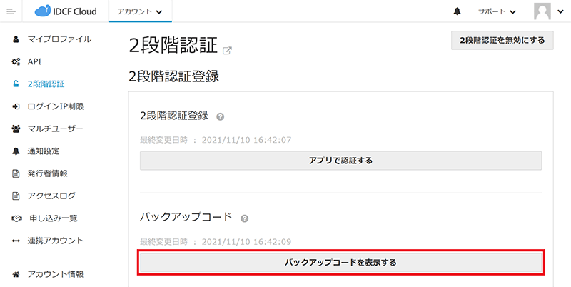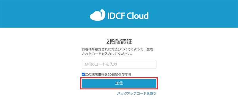 バックアップコードがない場合は、IDCFクラウドにログインすることができなくなります。