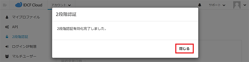 - 2段階認証有効化完了のポップアップ画面が表示されますので、[閉じる]をクリックします。