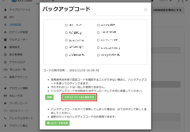 - バックアップコードが表示されます。