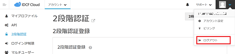 - 2段階認証でログインするため、一度ログアウトします。右上のアイコンをクリックし、プルダウンメニューから[ログアウト]をクリックします。