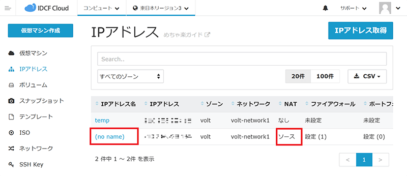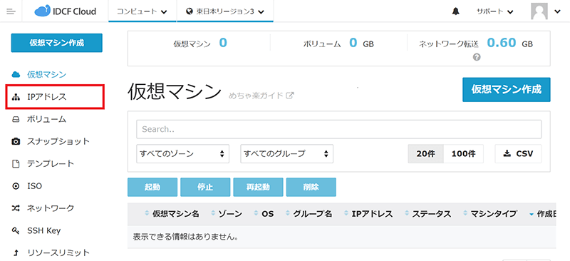 - クラウドコンソールにログインし、コンピュートのメニューにて[IPアドレス]をクリックします。
