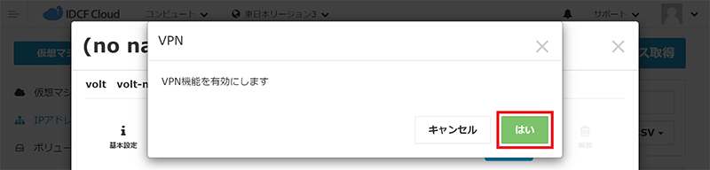 - 「VPN機能を有効にします」というポップアップ画面が表示されるので、[はい]をクリックします。