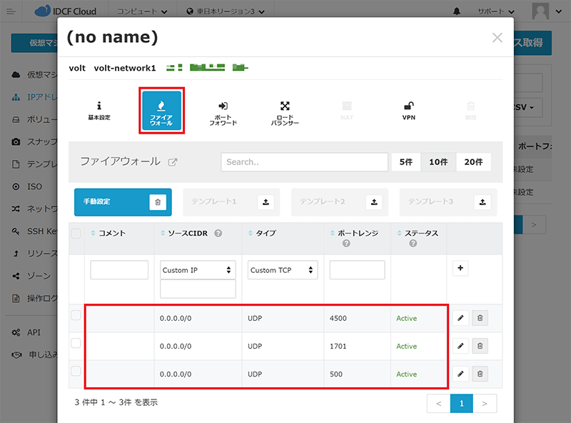 - [ファイアウォール]タブを選択し、手順4の画面に記載のとおり、自動的にファイアウォールルール(ソースCIDR:Any(0.0.0.0/0)、タイプ:UDP、ポートレンジ:500、1701、4500)が登録されていることを確認します。