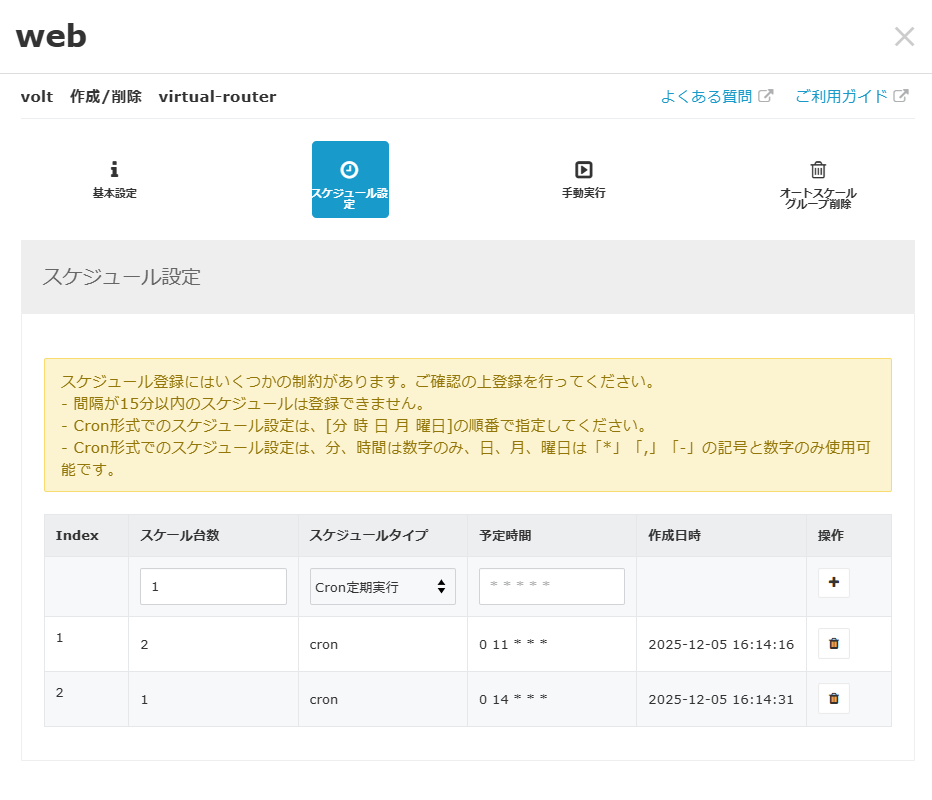 ※ スケールスケジュールは、仮想マシンの作成/起動処理を開始する時間であり、完了時間ではありません。 - ※ オートスケールのメンテナンスによりAPIが利用不可となった場合、スケールに失敗する恐れがあります。メンテナンスのスケジュールは事前に通知されます。