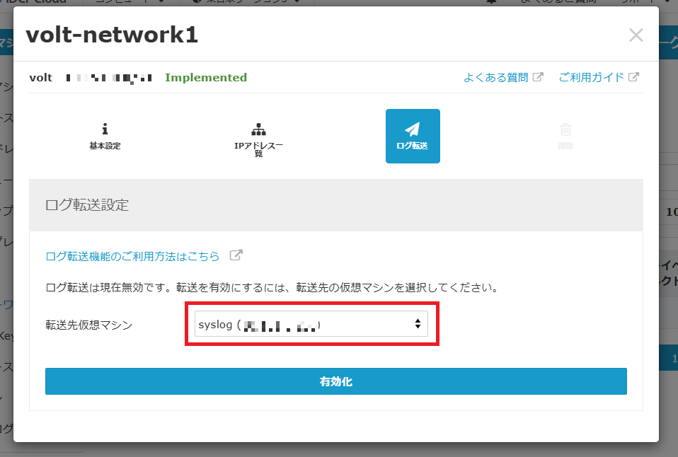 - ログ転送のタブを開いたら、先程作成した仮想マシン「syslog」を選択し、有効化ボタンを押します。