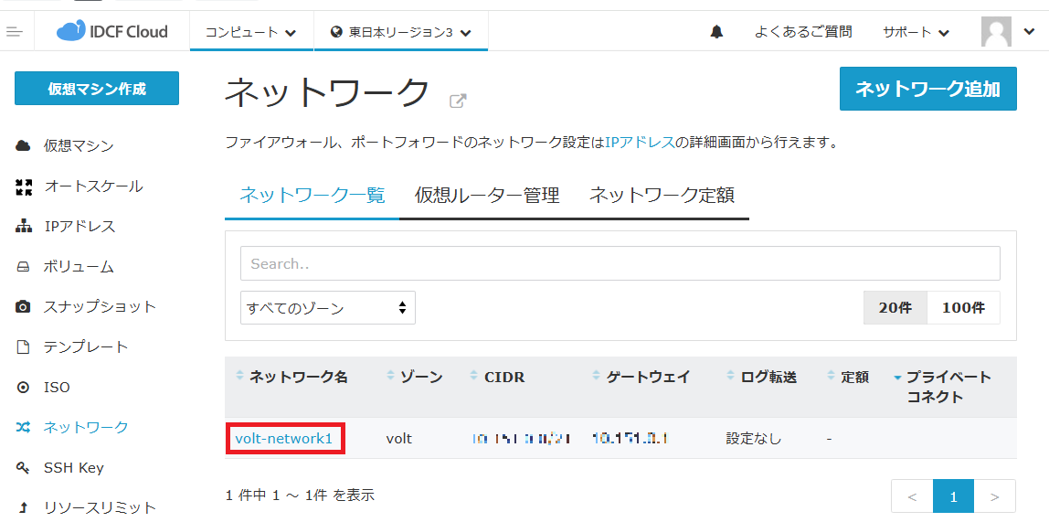 - ネットワーク画面を開き、ログ転送を有効化したいネットワークの詳細画面を開きます。本ご利用ガイドでは、「volt-network1」を例に説明します。