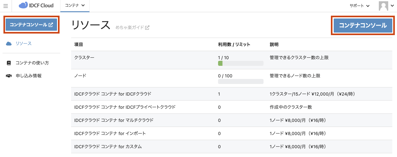 - 「コンテナコンソール」を選択するとコンテナコンソールに遷移します。