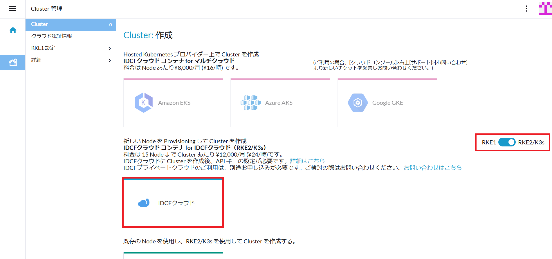 - 「RKE2/K3s」の「IDCFクラウド」を選択します。