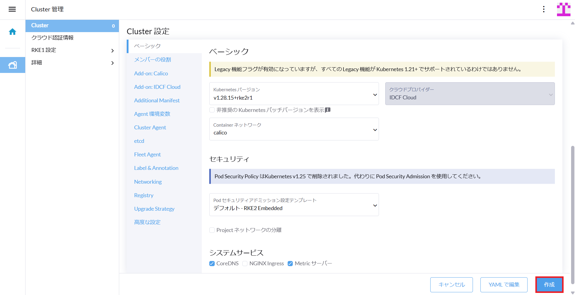 | Cluster 設定 | 作成するクラスターの各種設定を行います。 |