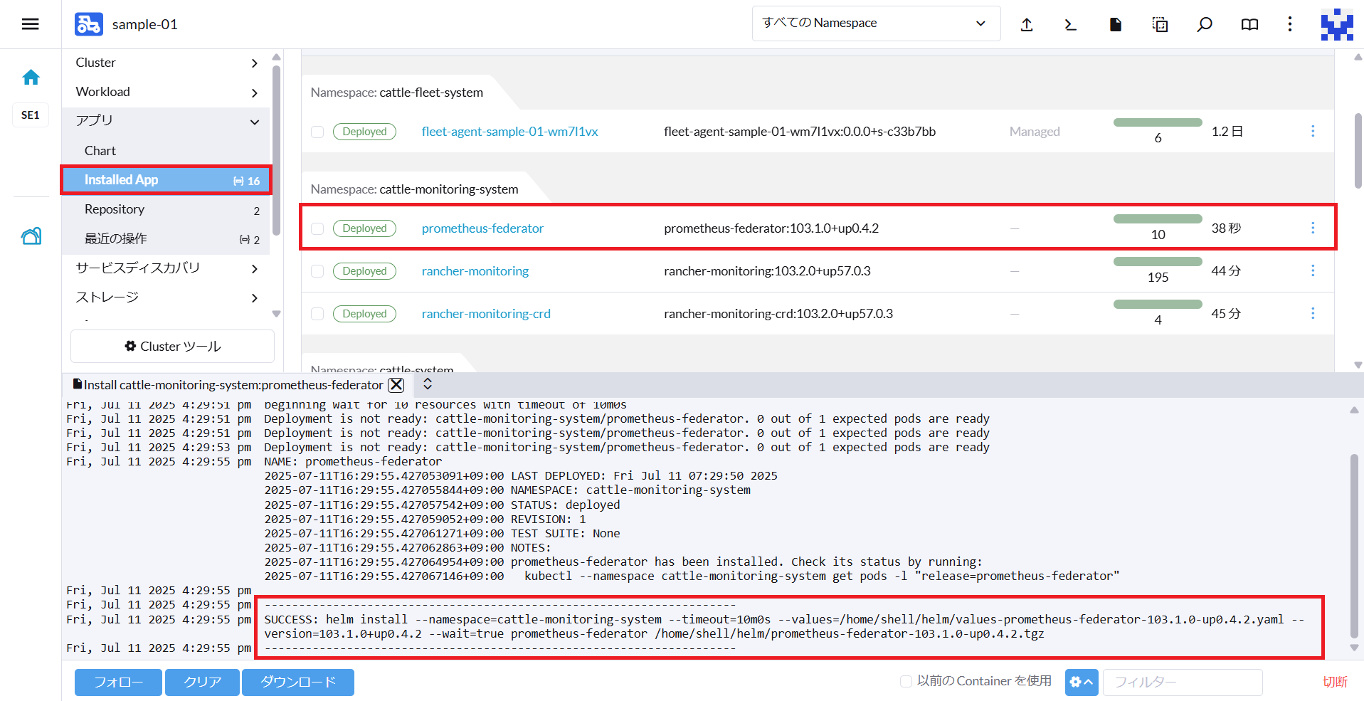 - クラスターダッシュボードの左メニューの下にある「アプリ(Apps)」から「Prometheus Federator」を選択します。