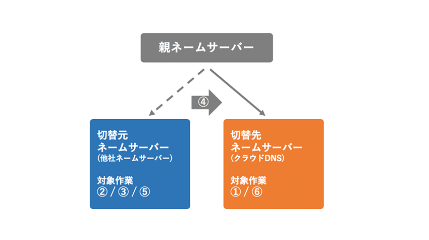 | ④ | ネームサーバーの切替2 | ・親ネームサーバーのNSレコード変更 | 親ネームサーバー | |
