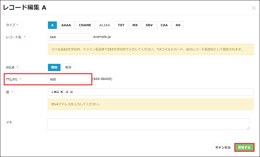 ▼注意 ここから先の手順は必ず、上記手順であるTTLの短縮完了後に、変更前のTTLに設定されていた時間が経過し、 キャッシュが完全に消えてから実施してください。 キャッシュが残っていると切戻しが必要な際に時間がかかることで、名前解決に影響が出る時間が長くなる可能性があります。(本手順の場合は、初期TTLが3600なので、TTLを600に修正した時点から数えて3600秒(1時間)以上経過してから実施することになります。)