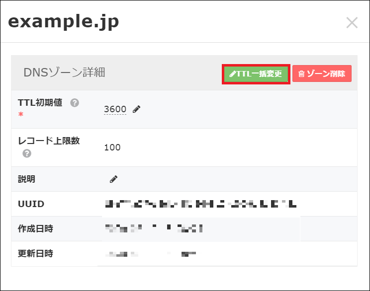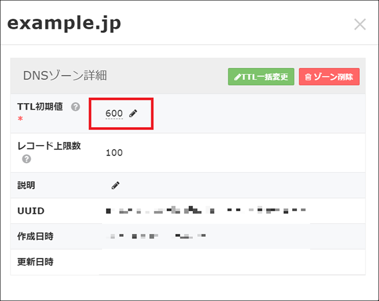 ネームサーバー切替のために設定していたTTLを600から任意の値に変更します。本手順では値を3600とします。TTL変更のやり方は「レコードごとに変更する」場合と「すべてのレコードをまとめて変更する」場合の二通りがあります。