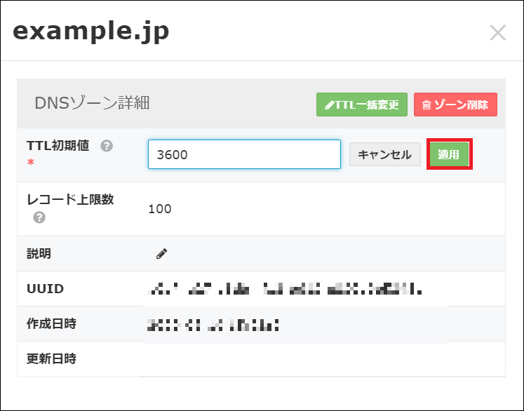切替元DNSゾーンに登録してあるレコードを、クラウドDNSのDNSゾーン「example.jp」に登録します。 全てのレコードを登録するまで①、②を繰り返してください。