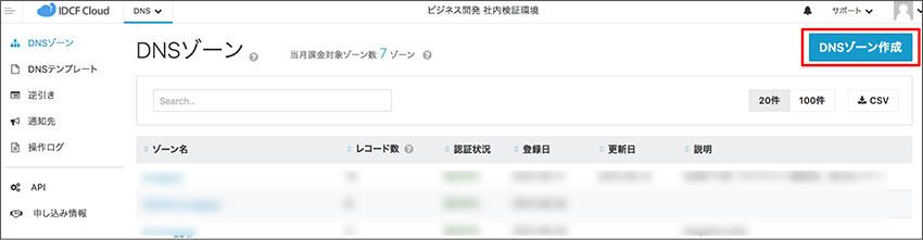 IDCFクラウドのDNSのページから「DNSゾーンの作成」をクリックします。