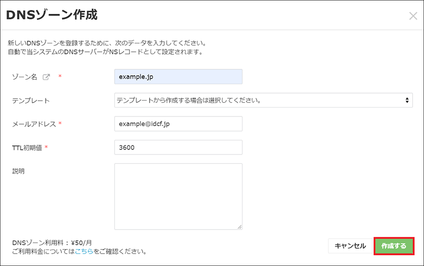 | メールアドレス | SOAレコードに登録されるメールアドレスとなります。 |
