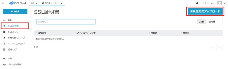 - メニューからSSL証明書をクリックします。SSL証明書一覧画面で「SSL証明書アップロード」ボタンをクリックします。