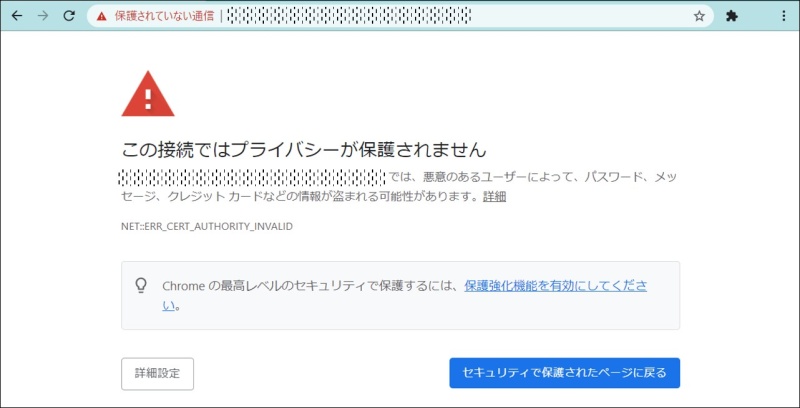 ※自己署名証明書を利用した場合は「NET::ERR_CERT_AUTHORITY_INVALID」と表示されます。こちらも同様に閲覧を続けて問題ありません。