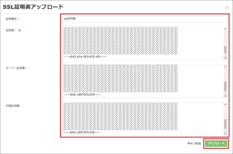 中間証明書がある場合は、中間証明書も貼り付けます(2048文字以内)。最後に「アップロード」ボタンをクリックします。