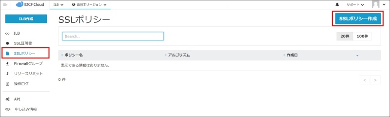 - メニューよりSSLポリシーをクリックします。SSLポリシー一覧画面で「SSLポリシー作成」ボタンをクリックします。