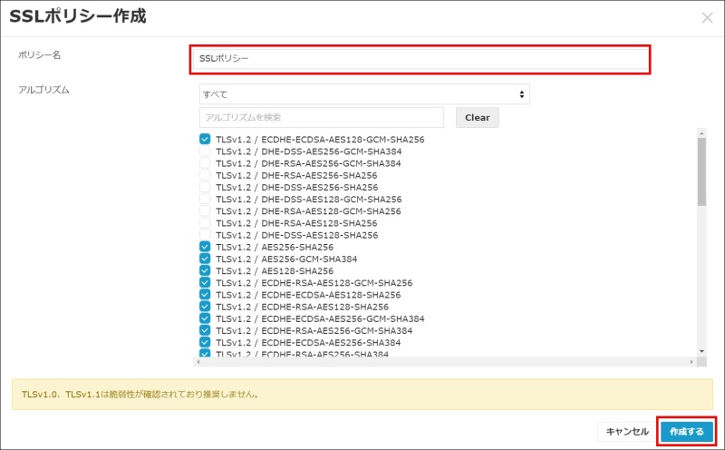 - SSLポリシー作成画面が表示されます。ポリシー名に任意の名前を記入し、「作成する」ボタンをクリックします。