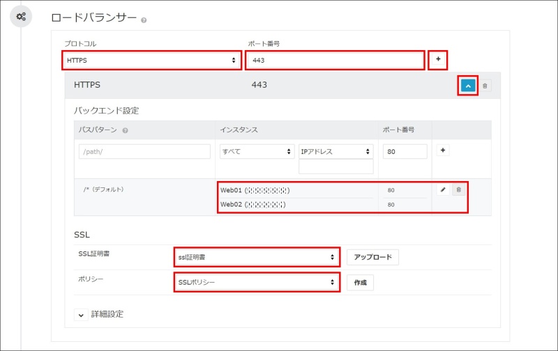- インフィニットLBの設定画面が表示されます。ロードバランサーの項目でプロトコルのプルダウンからHTTPSを「+」で追加します。HTTPS右側の矢印を開き、バックエンド設定画面を表示します。