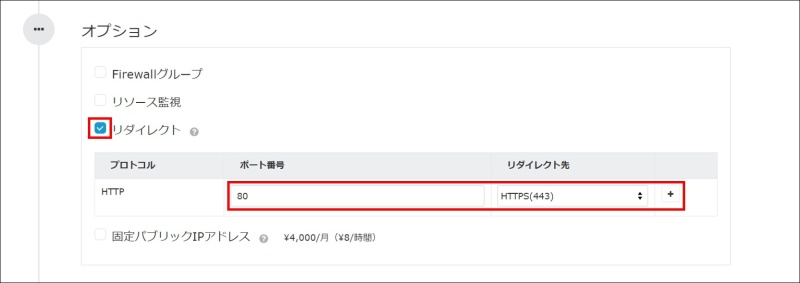 オプション項目のリダイレクトのチェックボックスをクリックして有効にします。httpリクエストを受けるポート番号とリダイレクト先を指定し「+」ボタンで追加します。
